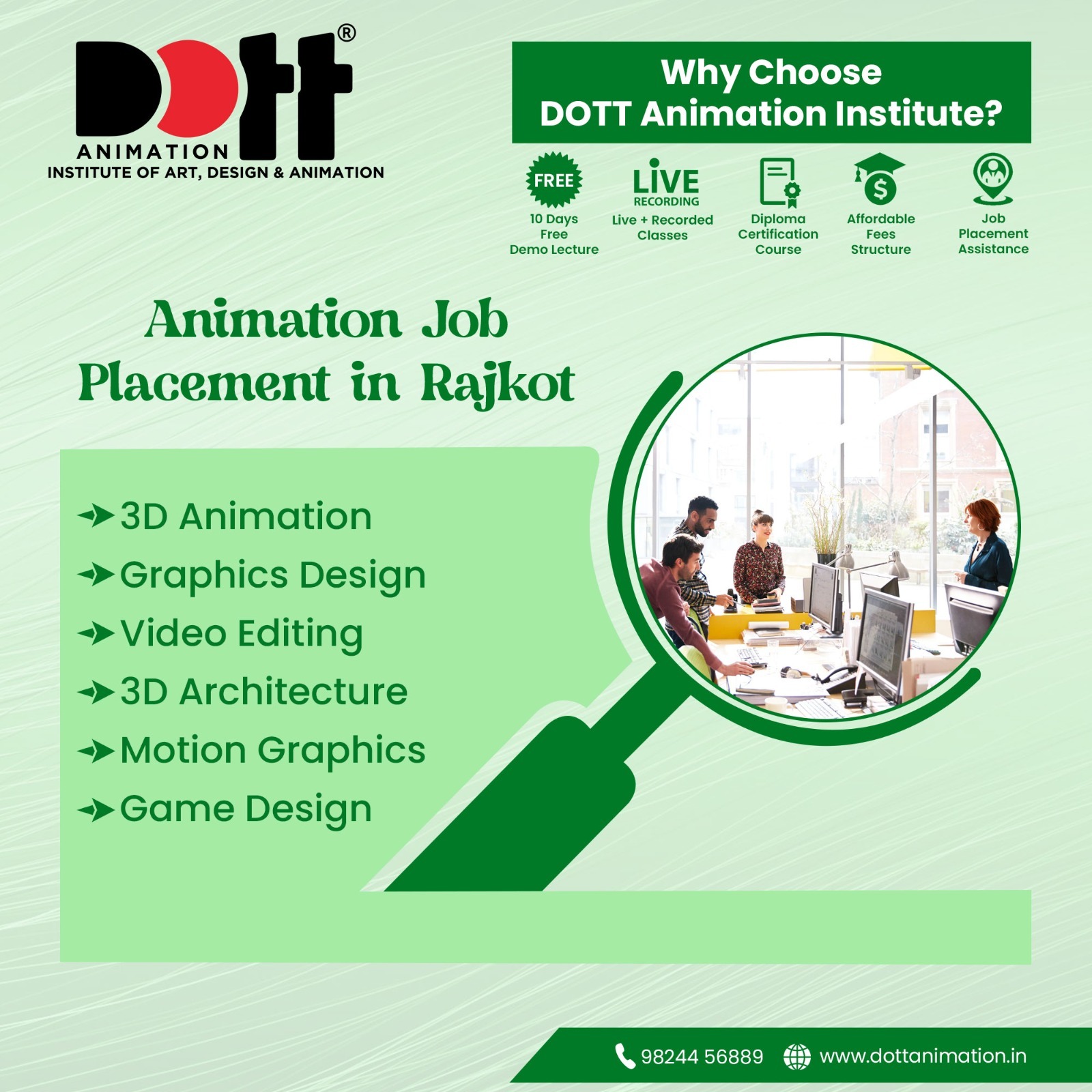 Build Your Creative Career with DOTT Animation Institute – Rajkot’s Trusted Name in Animation & Design Education Animation Job Placement in Rajkot – Build Skills that Get You Hired Learning animation is just the first step—the real success comes with the right job. At DOTT Animation Institute, Rajkot, we not only provide top-class training in 2D, 3D, VFX, Motion Graphics, and Video Editing, but also ensure that every student gets career guidance and placement opportunities in leading studios, agencies, and creative companies. Why Online & Offline Animation Learning with DOTT Makes a Real Difference: ~100% Job Placement Support ~Live Sessions with Industry Professionals + Recorded Access ~Beginner to Advanced Modules in 2D, 3D, VFX & More ~Industry-Based Portfolio Building & Freelancing Guidance ~Career Counseling, Doubt-Solving & Internship Help ~No Prior Knowledge Required – Just Passion & Creativity ~350+ Success Stories from Rajkot & Beyond ~Affordable Fee Structure + Practical Assignments At DOTT, we help you turn your creativity into a career—be it in graphic design, VFX, motion graphics, video editing, 3D architecture, or game design. Best Courses, Rajkot, Ahmedabad, Amreli, Anand, Aravalli, Banaskantha, Bharuch, Bhavnagar, Botad, Chhota Udaipur, Dahod, Dang, Devbhoomi Dwarka, Gandhinagar, Gir Somnath, Jamnagar, Junagadh, Kachchh, Kheda, Mahisagar, Mehsana, Morbi, Narmada, Navsari, Panchmahal, Godhra, Porbandar, Dottanimation